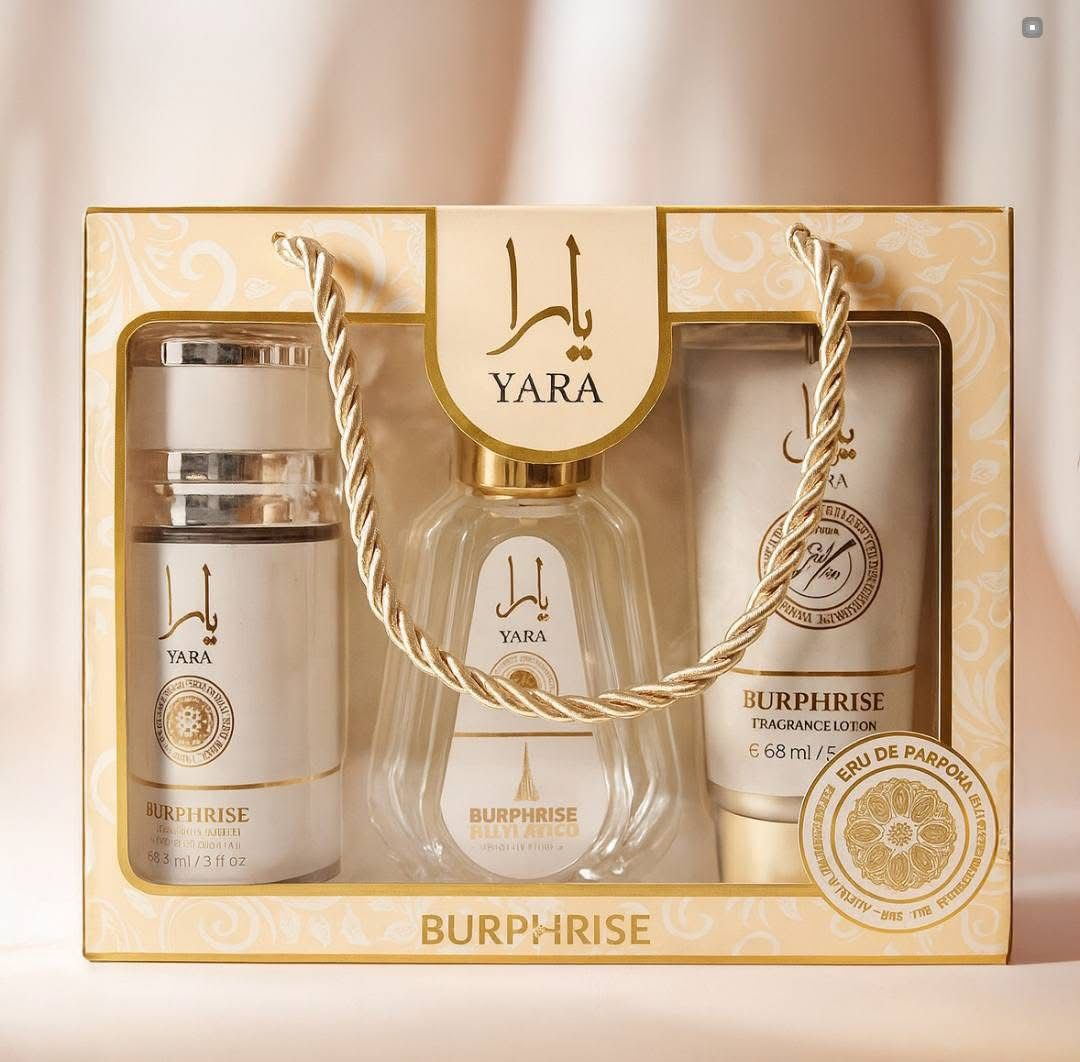 Lattaffa Burphise Yara Moi viene en un set de regalo de 3 perfumes para mujer- Eau de parfum de 50ml + Loción perfumada de 88ml + Jabonería perfumado de 88g.